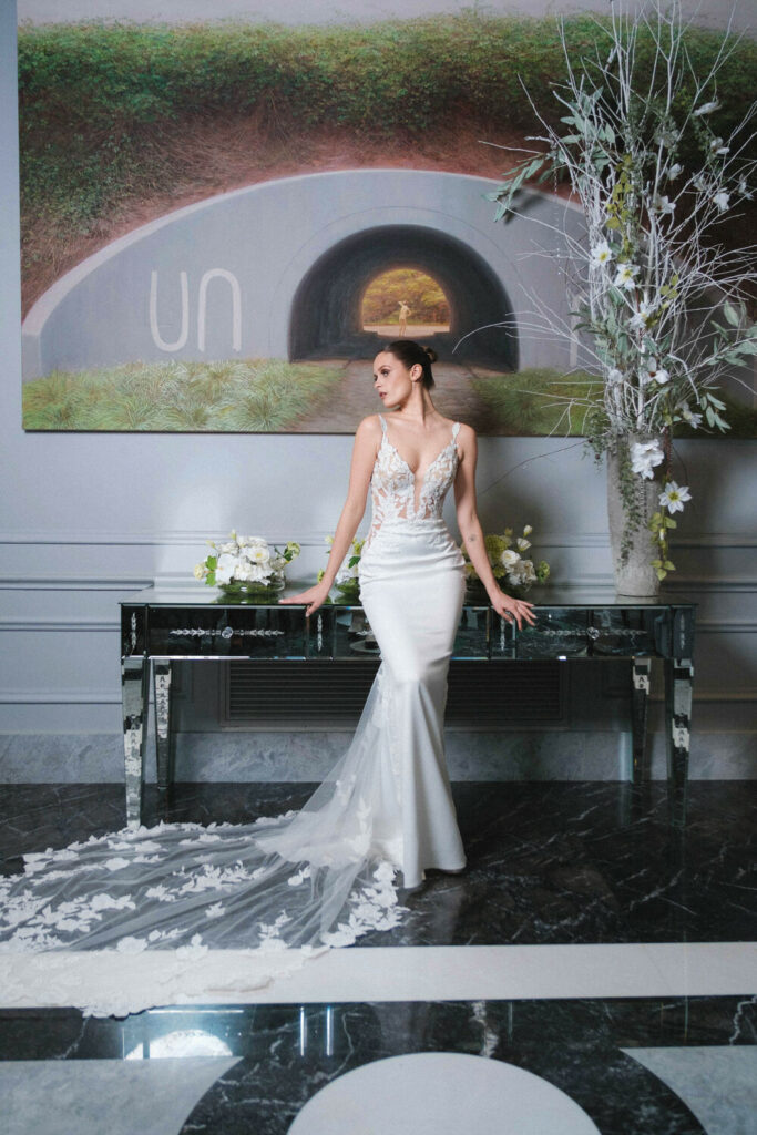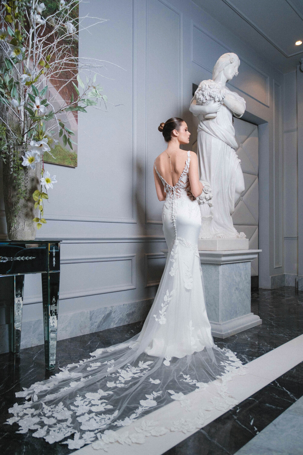 Une création sirène en satin de soie qui sublime les courbes avec fluidité et élégance. Le buste est orné d’une dentelle raffinée effet peau, apportant délicatesse et sensualité à la silhouette. La traîne sublimement travaillée en dentelle prolonge la création avec majesté, offrant un rendu glamour, couture et résolument haut de gamme.