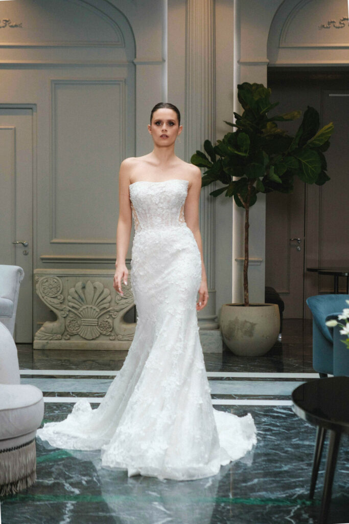 Une création pensée comme une pièce d’exception. Réalisée en dentelle italienne, elle se distingue par ses fleurs en 3D délicatement appliquées, apportant profondeur et poésie à la matière. Son bustier contemporain aux lignes sculpturales sublime la silhouette avec élégance, tandis que sa traîne majestueuse prolonge la robe avec grâce et modernité. Une création affirmée, destinée à une mariée en quête d’un style couture, raffiné et résolument unique.