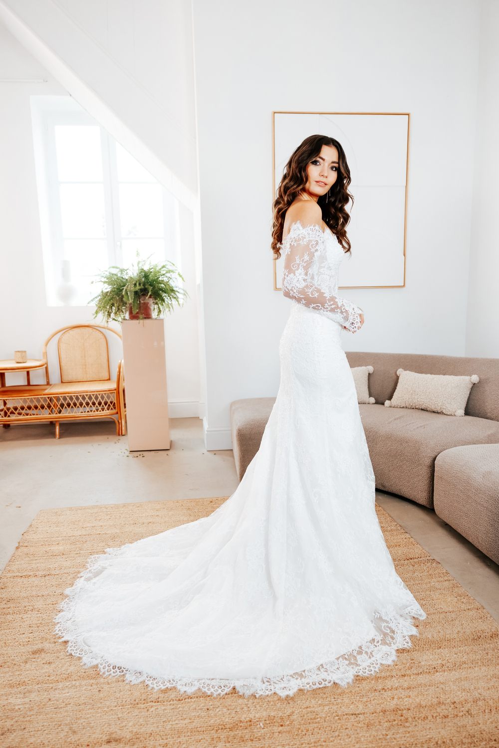 Une création pensée comme une pièce d’exception. Réalisée en dentelle italienne, elle se distingue par ses fleurs en 3D délicatement appliquées, apportant profondeur et poésie à la matière. Son bustier contemporain aux lignes sculpturales sublime la silhouette avec élégance, tandis que sa traîne majestueuse prolonge la robe avec grâce et modernité. Une création affirmée, destinée à une mariée en quête d’un style couture, raffiné et résolument unique.
